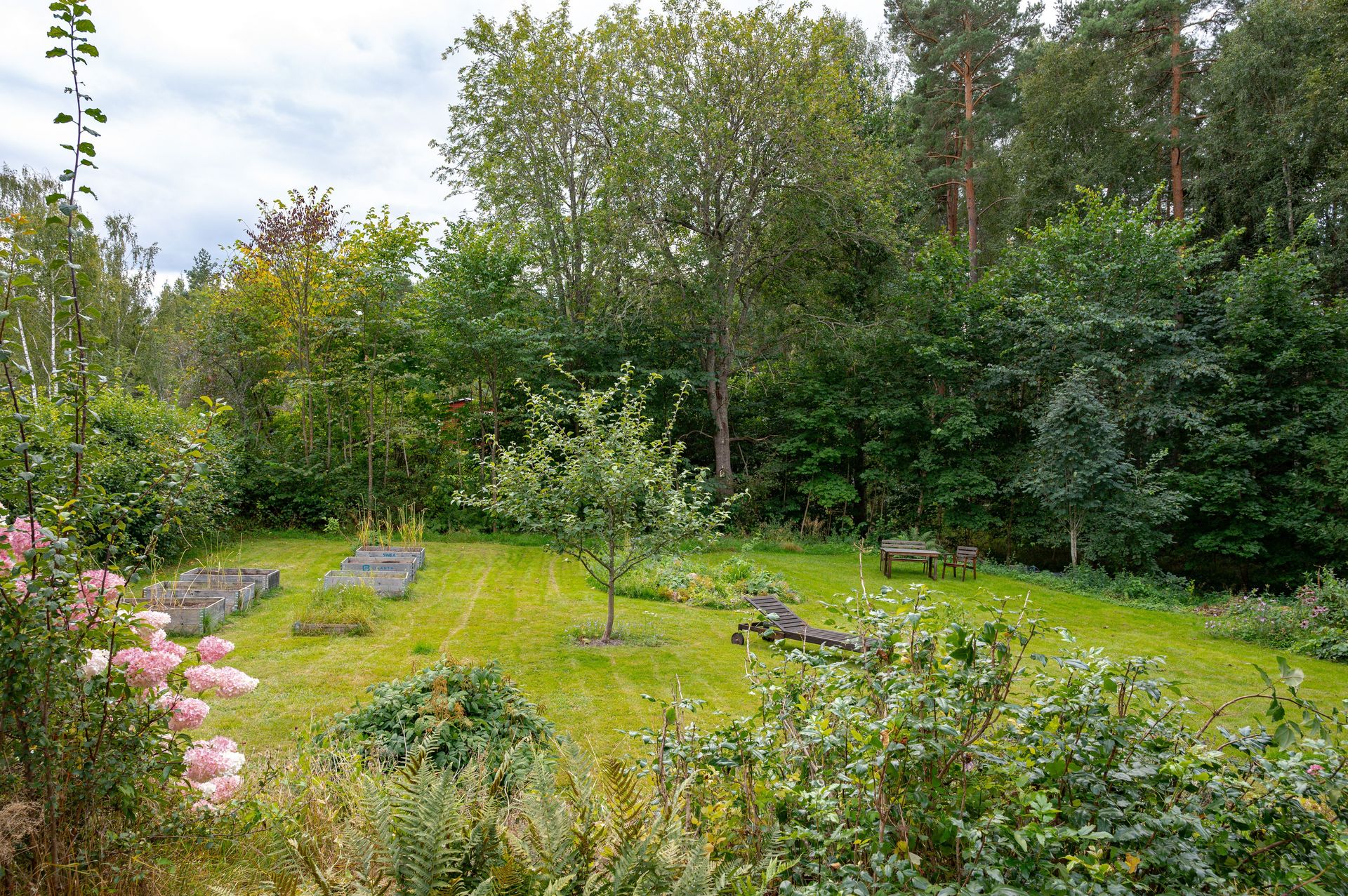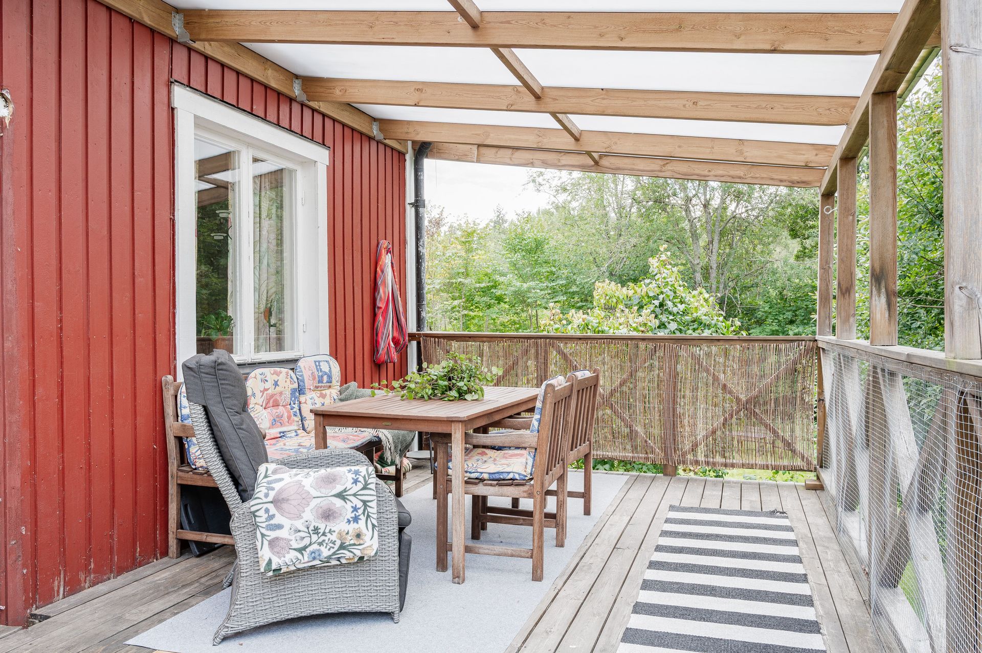 Uteplats under tak. Trädgård med gräsmatta och planteringar.