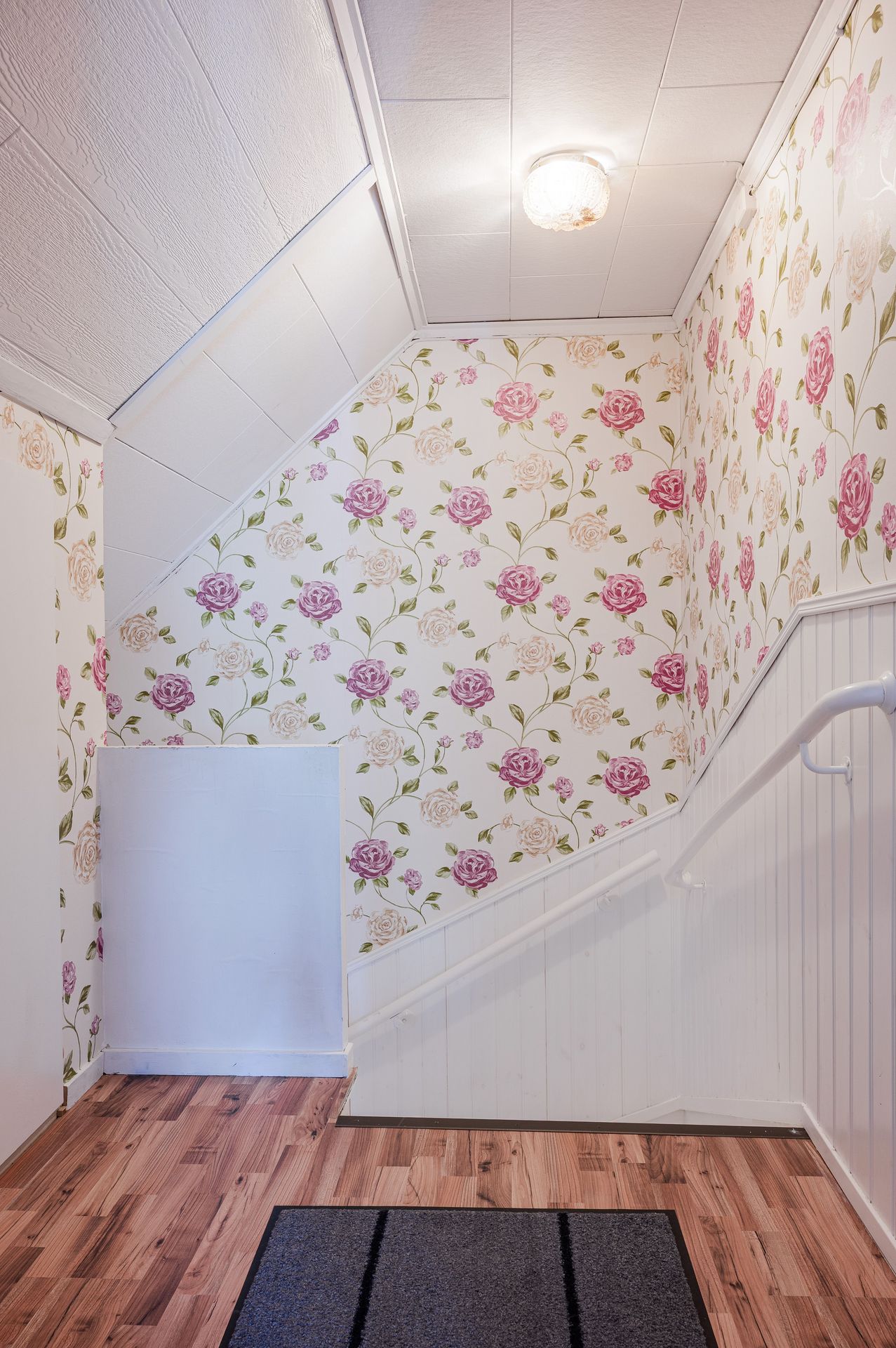 Hall med trägolv. Allrum med trägolv. Vardagsrum med trägolv och utgång till altanen. Altan, delvis under tak, i västerläge. Badrum med klinker på golv och kakel på vägg, utrustat med toalett, tvättställ, handdukstork samt dusch. Kök med trägolv och matplats. Köket är utrustat med spis, fläkt samt kombinerad kyl och frys. Övre plan Hall med garderober. 2 st sovrum med laminatgolv. Källarplan Betongkällare med tvättmaskin, förråd och pannrum.