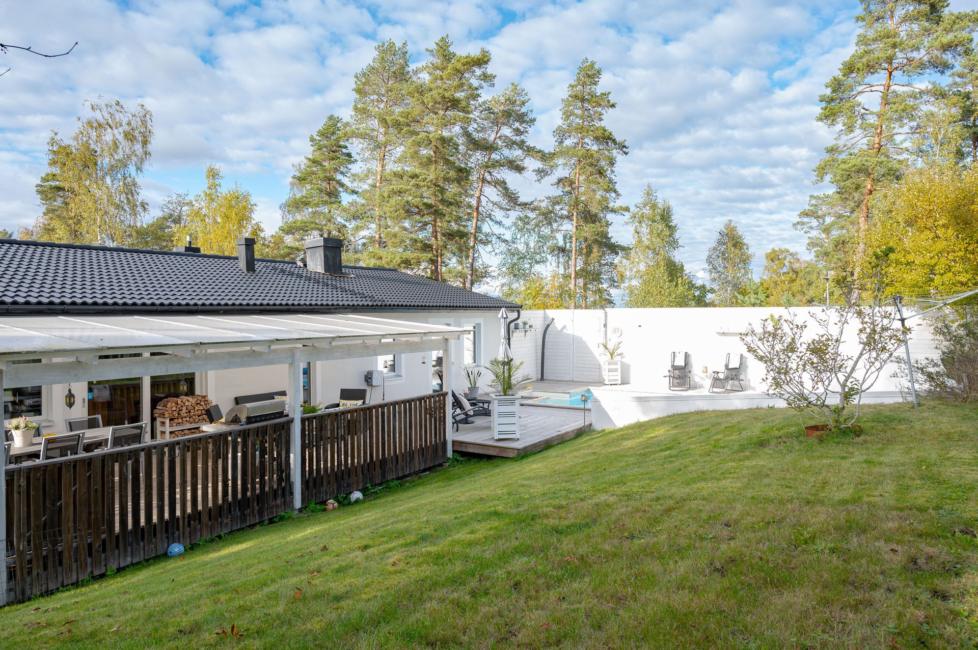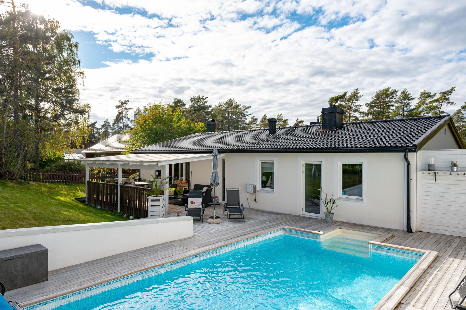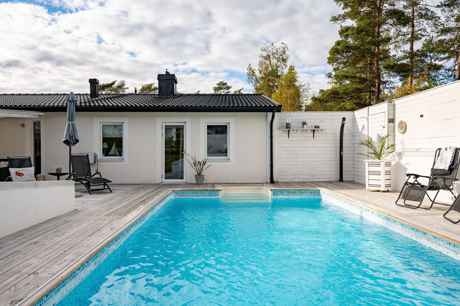 2021 - Nytt yttertak med Benders taktegel Candor med nya råspontluckor. Altantak, ny trall runt pool. Kamin installerad på övervåning. - Byggnadssätt: Fönster: 3-glasfönster isoler. Skorstenstyp: Skorsten av plåt. Utvändiga plåtarbeten: Plåt. Avlopp: Kommunalt avlopp. Vatten: Kommunalt vatten året om. Taktyp/takbeklädnad: Betongpannor. Grund: Betongplatta. Stomme: Betong. Fasadtyp: Puts. Bjälklag: Gjutna valv.