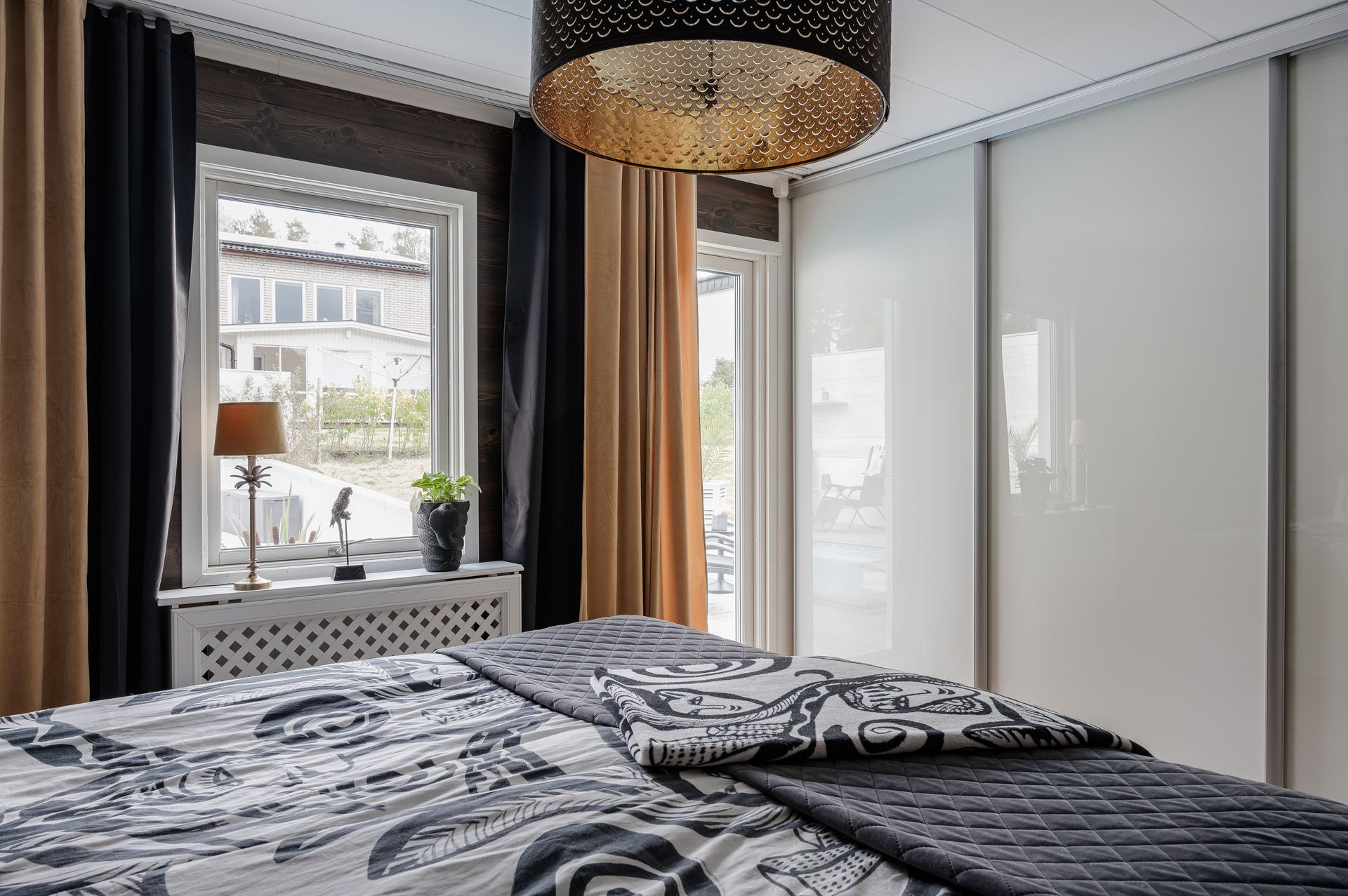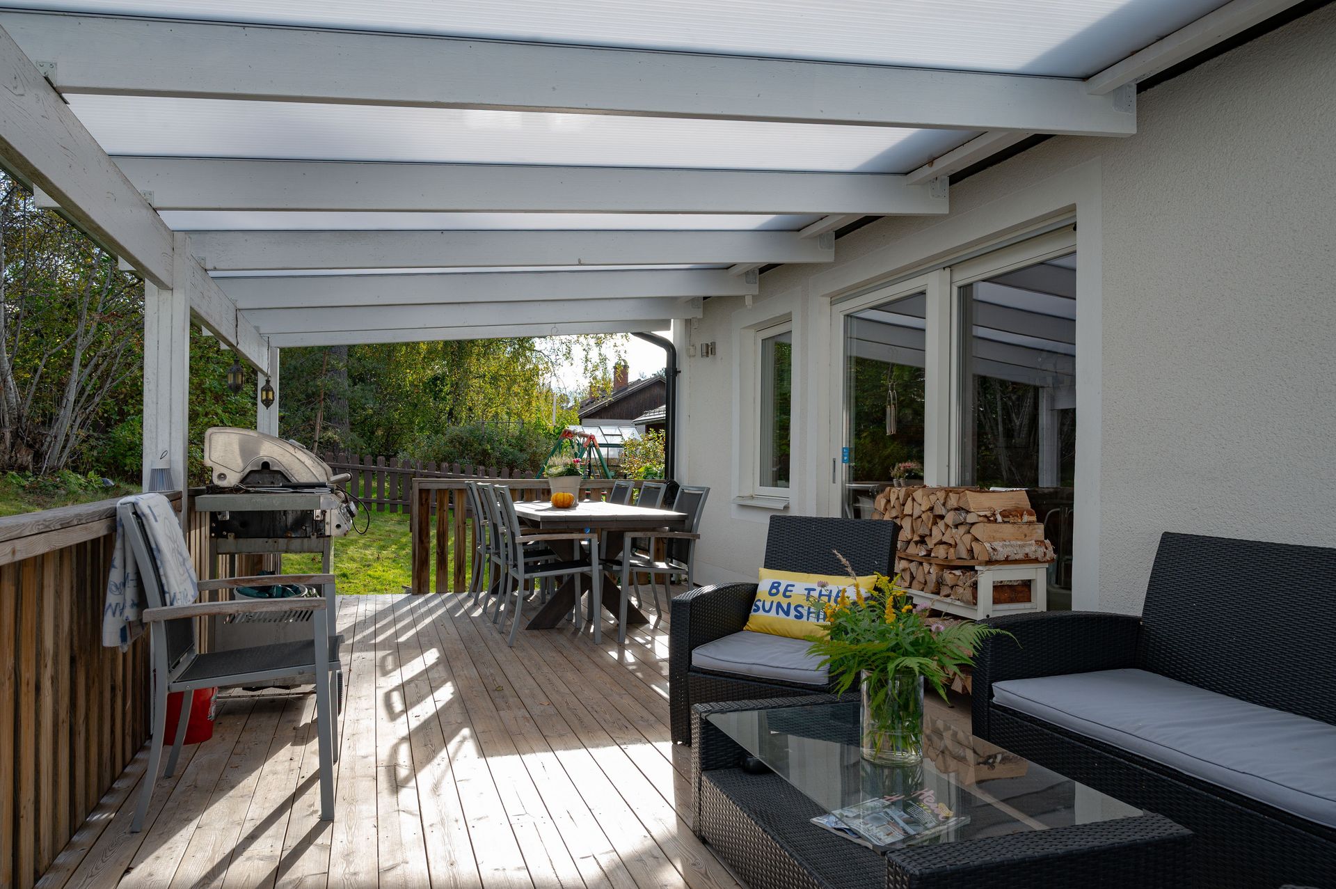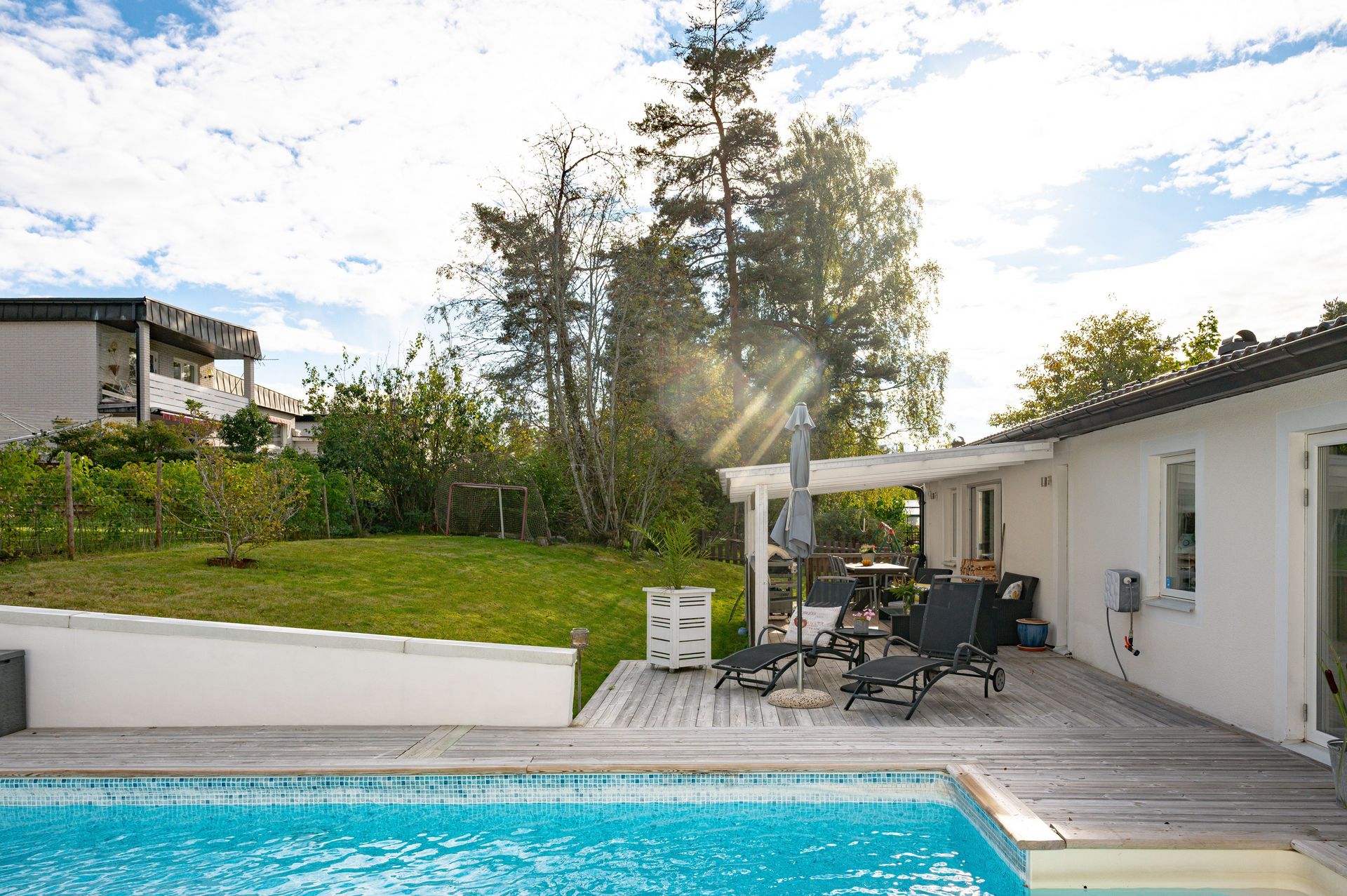 2021 - Nytt yttertak med Benders taktegel Candor med nya råspontluckor. Altantak, ny trall runt pool. Kamin installerad på övervåning. - Byggnadssätt: Fönster: 3-glasfönster isoler. Skorstenstyp: Skorsten av plåt. Utvändiga plåtarbeten: Plåt. Avlopp: Kommunalt avlopp. Vatten: Kommunalt vatten året om. Taktyp/takbeklädnad: Betongpannor. Grund: Betongplatta. Stomme: Betong. Fasadtyp: Puts. Bjälklag: Gjutna valv.