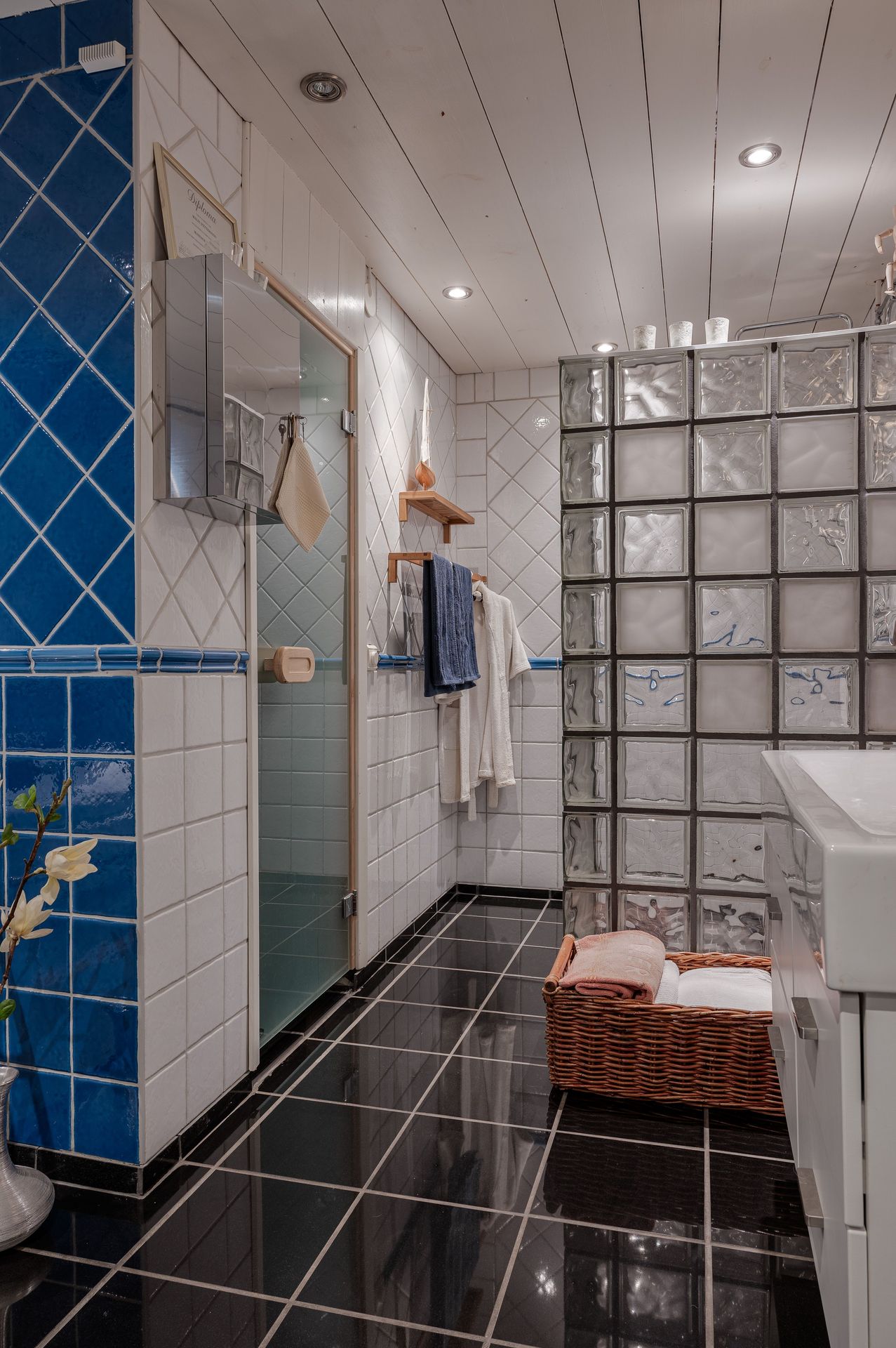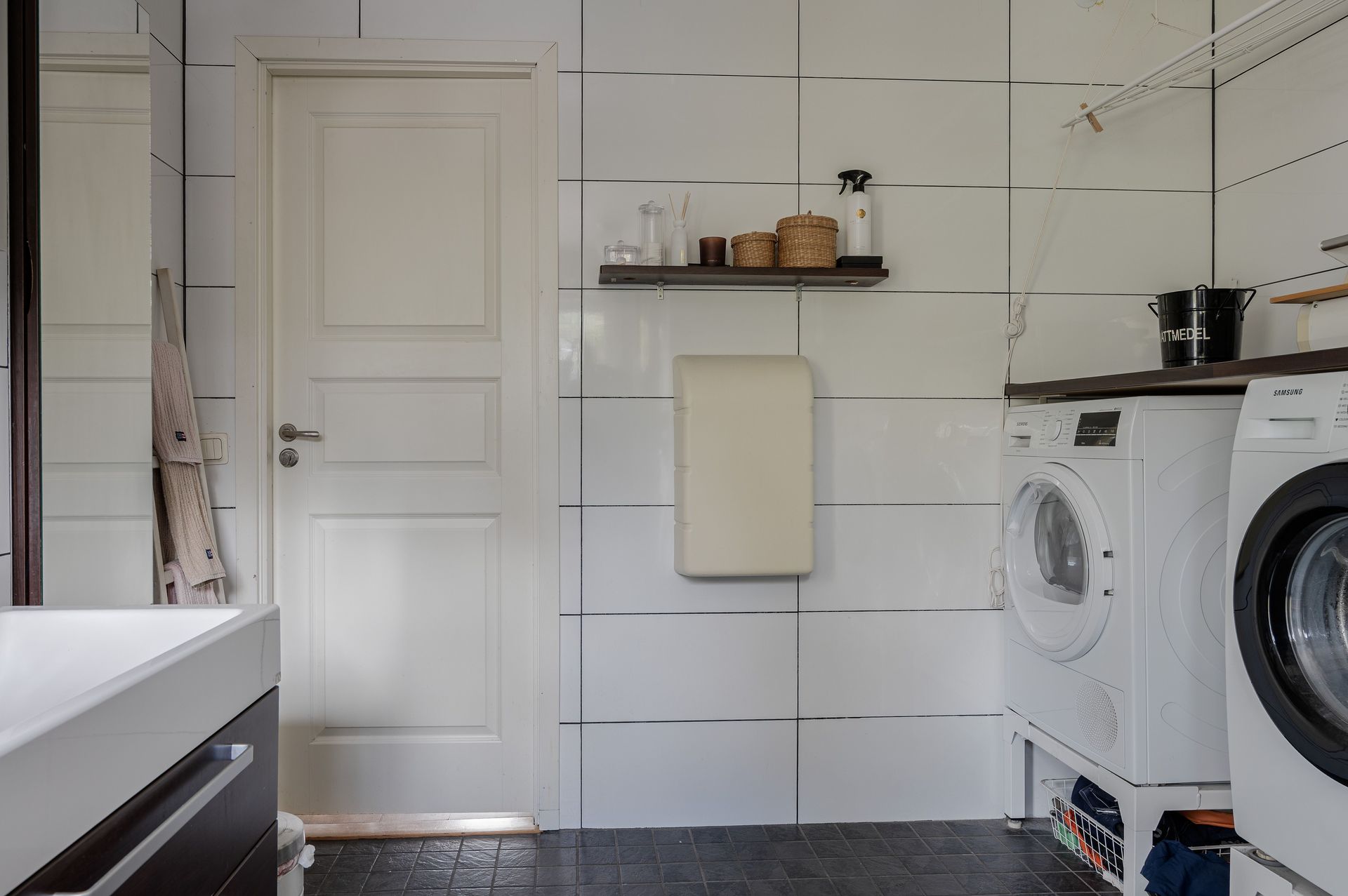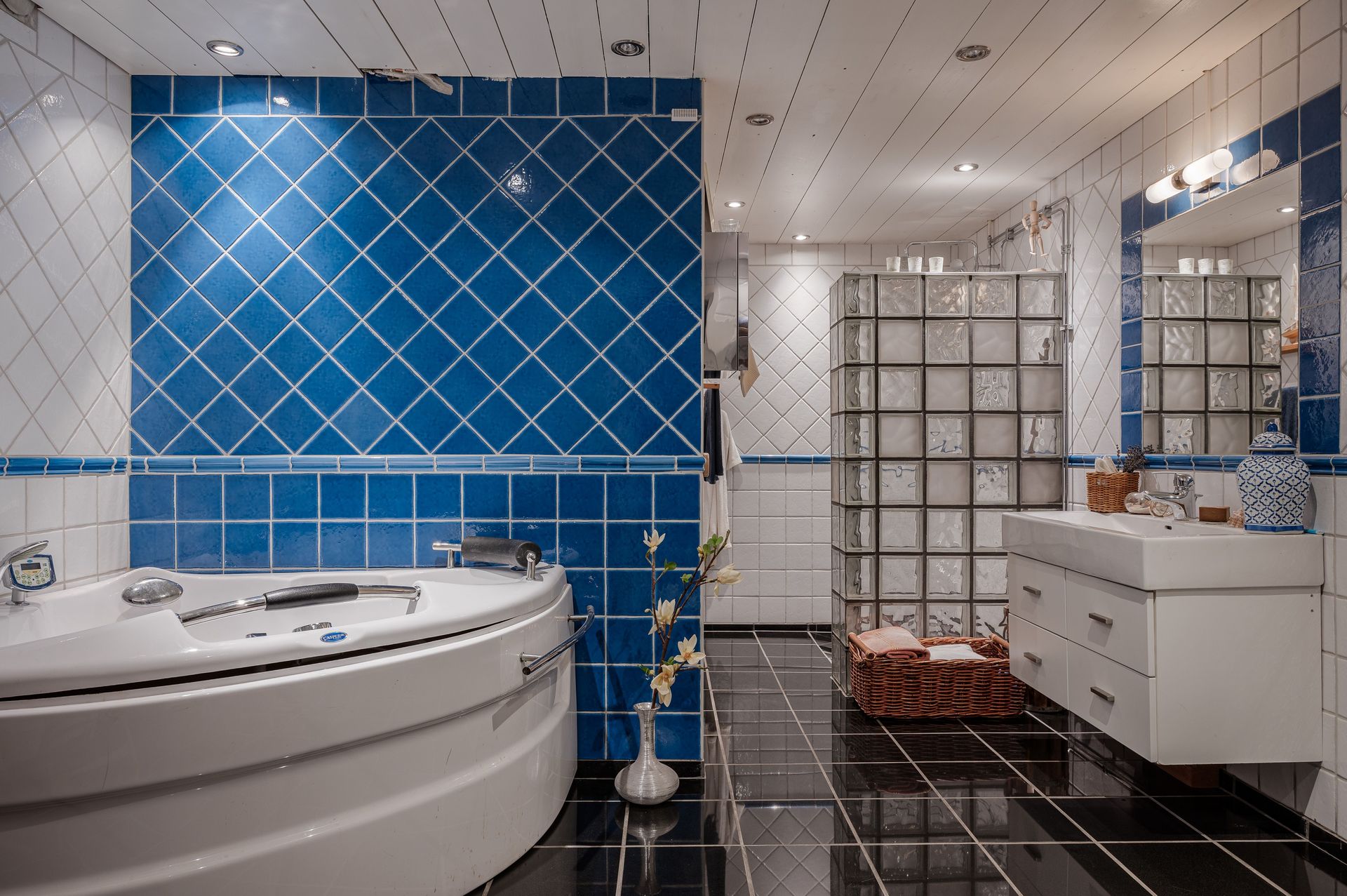 Entré med klinkergolv och hiss. Kapprum med vinylgolv. Wc med toalett och tvättställ. Sovrum med plastmatta. Klädkammare. Badrum med plastmatta på golv och kakel på vägg, utrustat med dusch och toalett. Relaxavdelning med klinker på golv och kakel på vägg, utrustat med dusch, badkar, bastu samt golvvärme. Sovrum med vinylgolv och klädkammare. Pannrum med betonggolv. Övre plan Allrum med parkettgolv och kamin. Kök med öppen planlösning mot allrummet. Köket är utrustat med häll, fläkt, ugn, micro, kyl- och frys i fullhöjd samt diskmaskin. Matplats för 10-12 personer. 3 sovrum med laminatgolv. Badrum med tvättavdelning med klinker på golv och kakel på vägg, utrustat med toalett, tvättställ, dusch samt tvättmaskin och torktumlare. Balkong.