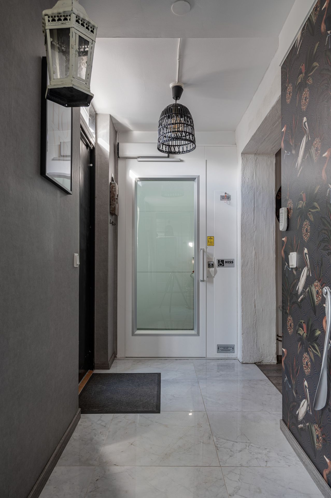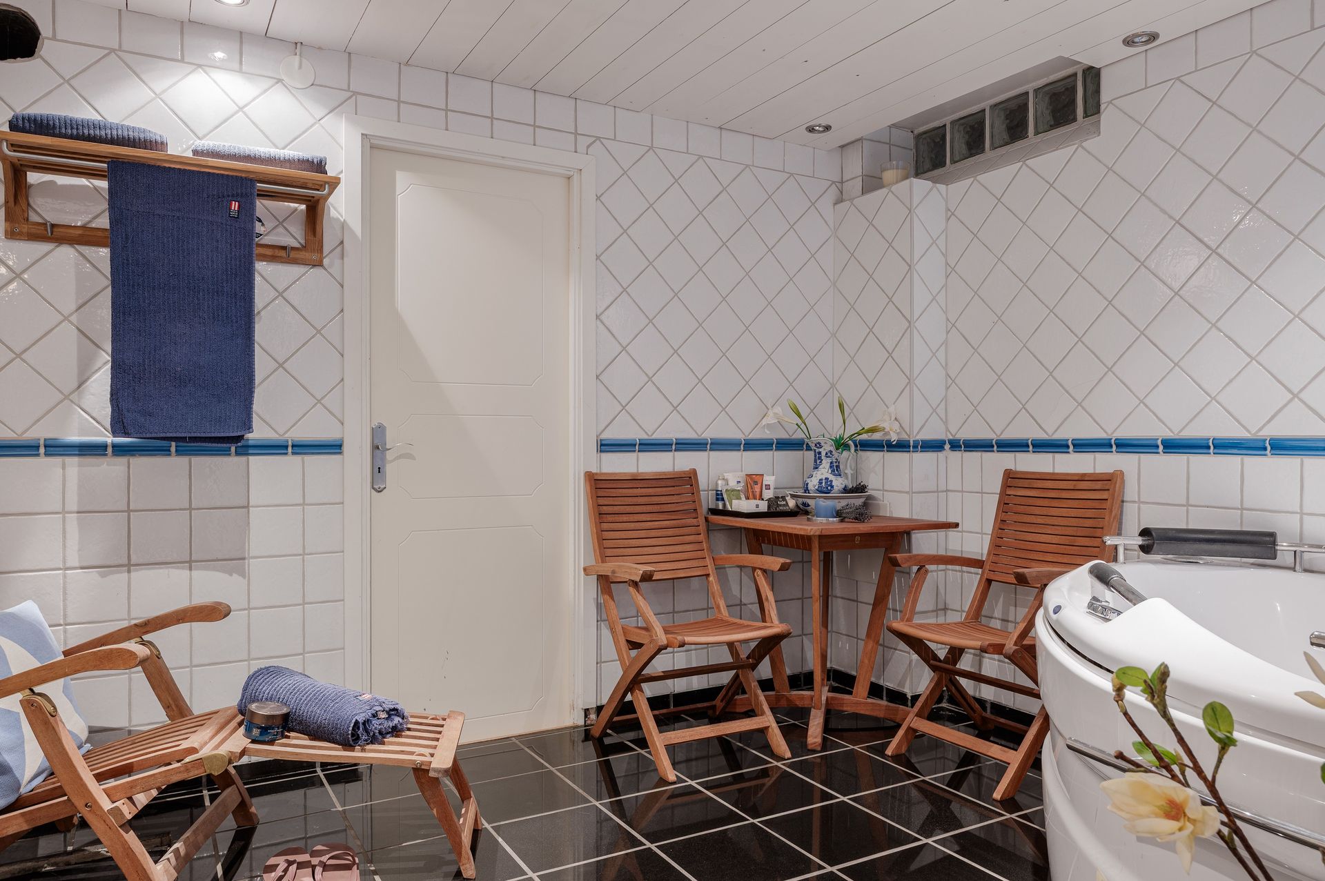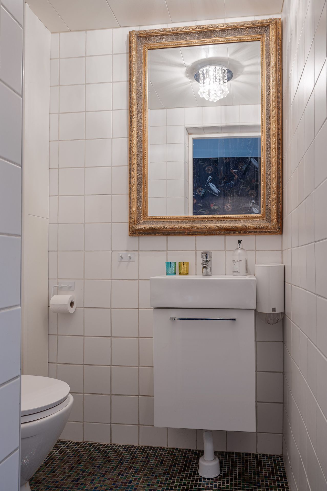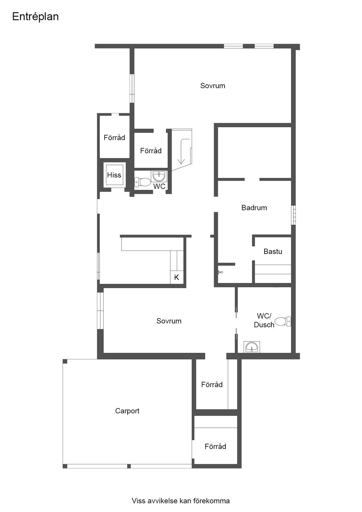 Entré med klinkergolv och hiss. Kapprum med vinylgolv. Wc med toalett och tvättställ. Sovrum med plastmatta. Klädkammare. Badrum med plastmatta på golv och kakel på vägg, utrustat med dusch och toalett. Relaxavdelning med klinker på golv och kakel på vägg, utrustat med dusch, badkar, bastu samt golvvärme. Sovrum med vinylgolv och klädkammare. Pannrum med betonggolv. Övre plan Allrum med parkettgolv och kamin. Kök med öppen planlösning mot allrummet. Köket är utrustat med häll, fläkt, ugn, micro, kyl- och frys i fullhöjd samt diskmaskin. Matplats för 10-12 personer. 3 sovrum med laminatgolv. Badrum med tvättavdelning med klinker på golv och kakel på vägg, utrustat med toalett, tvättställ, dusch samt tvättmaskin och torktumlare. Balkong.