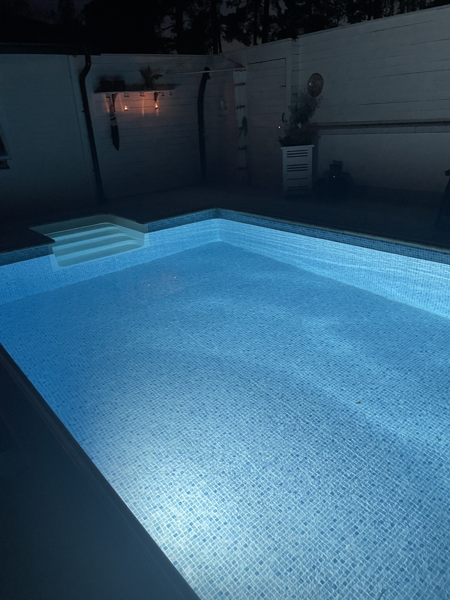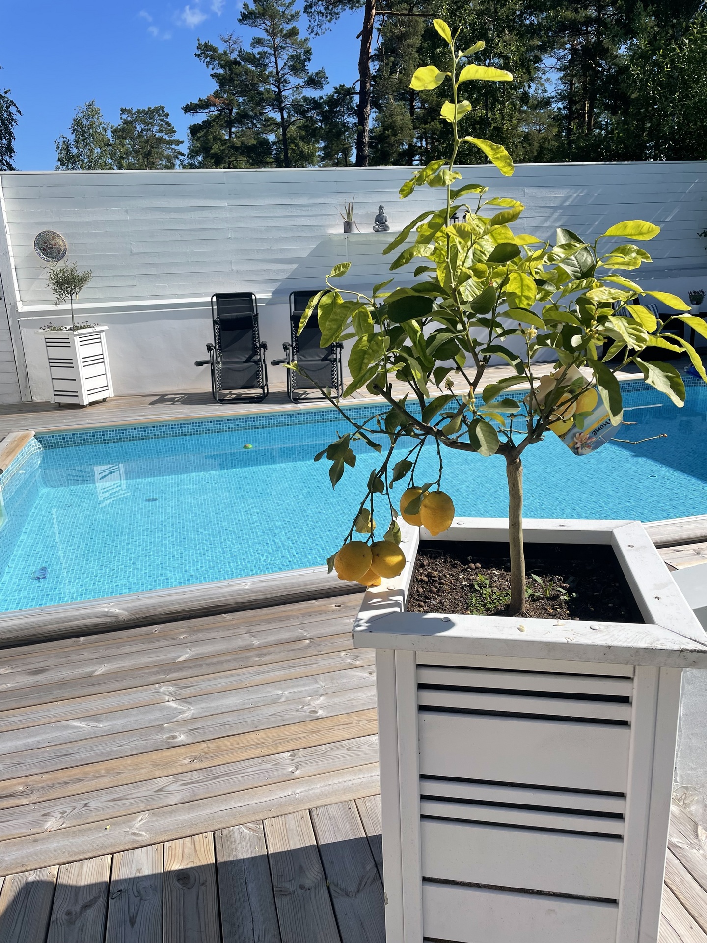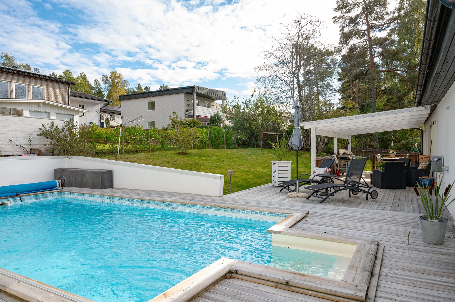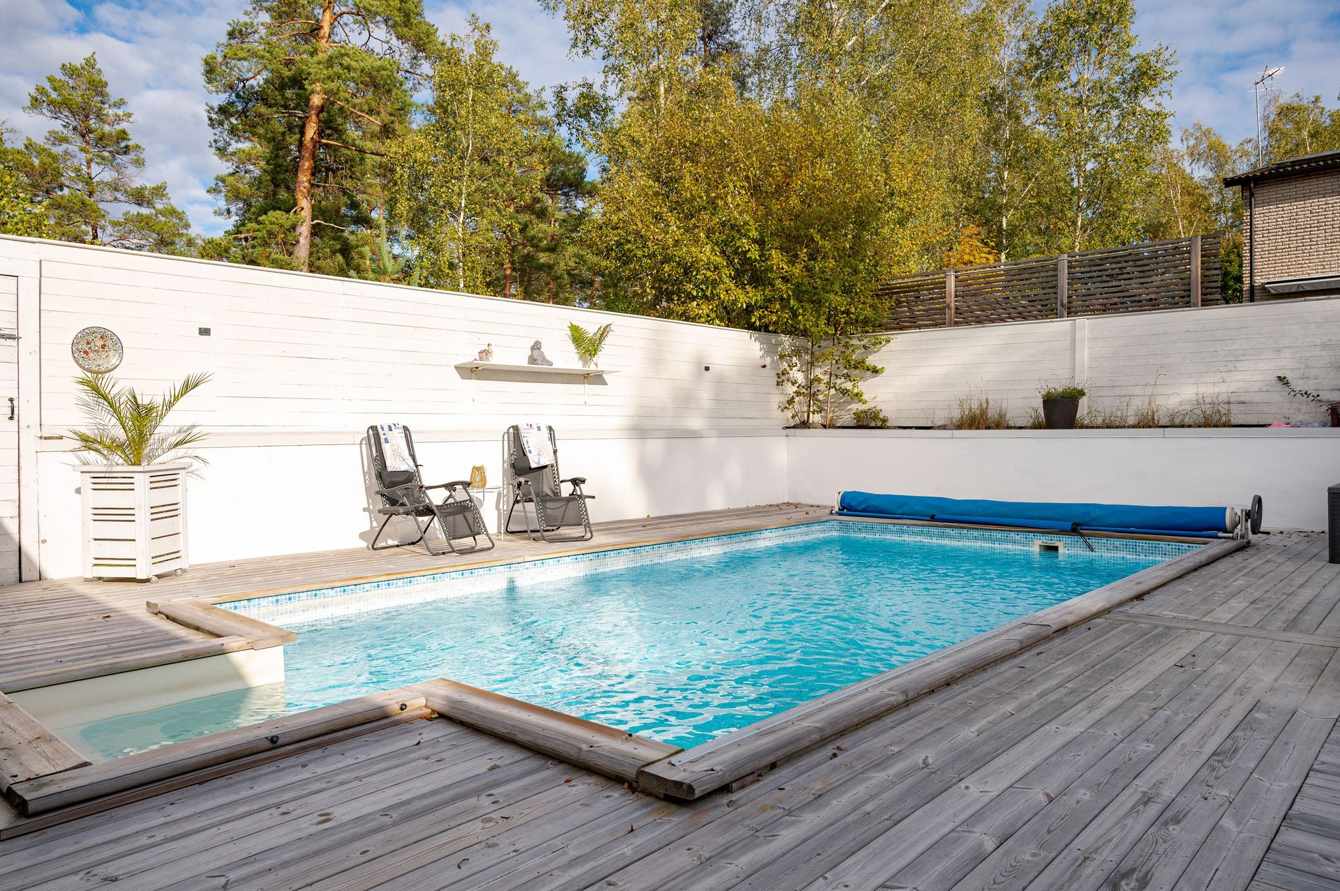 Pool med pooldäck och utedusch. Trädgård med gräsmatta. Altan under tak. Balkong.