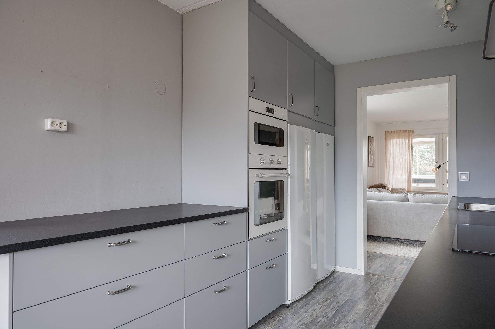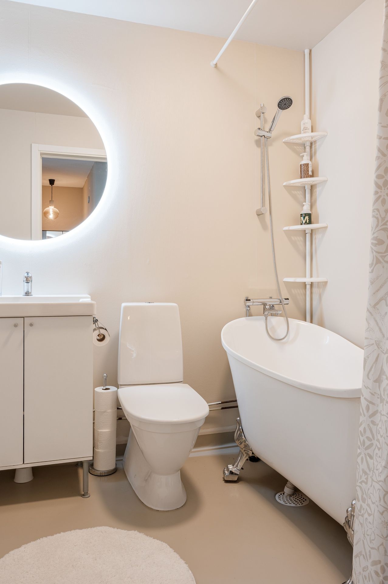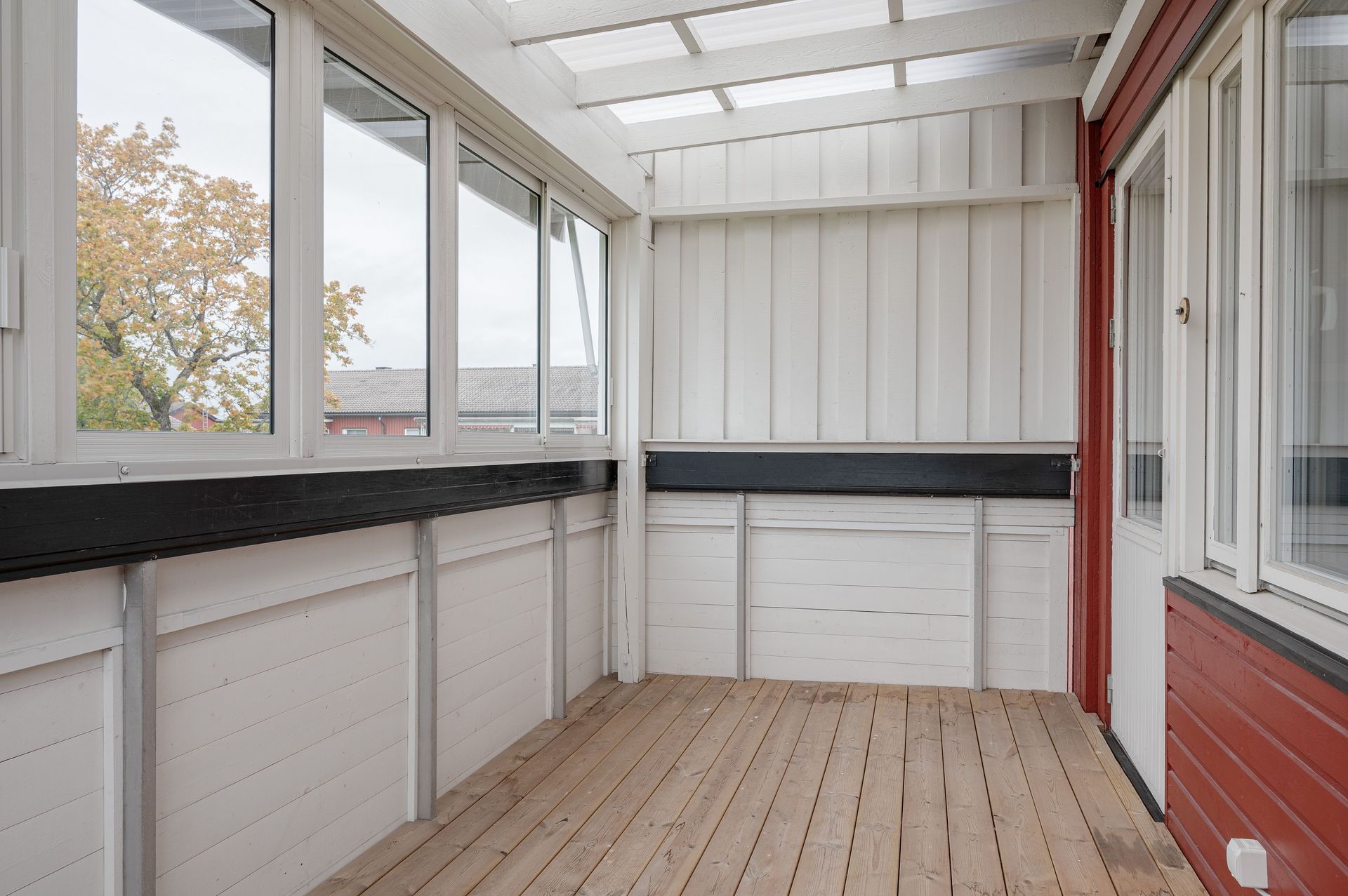Entré med hatthylla. Hall med laminatgolv. Klädkammare. Sovrum med laminatgolv. Allrum med laminatgolv och utgång till inglasad balkong. Kök med laminatgolv och rymlig matplats. Köket är utrustat med häll, fläkt, diskmaskin, ugn, micro samt kombinerad kyl och frys. Sovrum med laminatgolv. Badrum med plastmatta på golv och vägg, utrustat med toalett, tvättställ, badkar samt tvättmaskin.