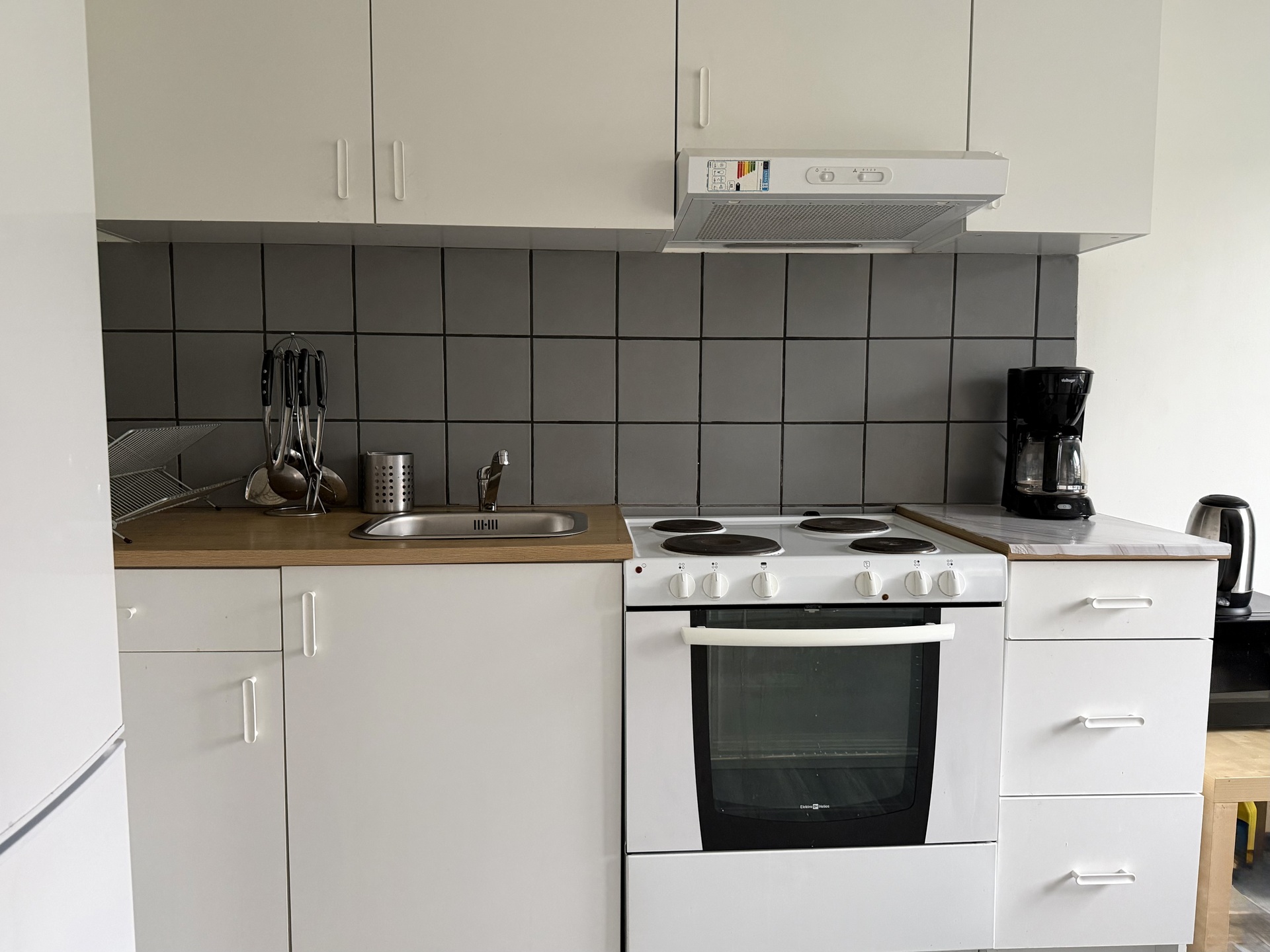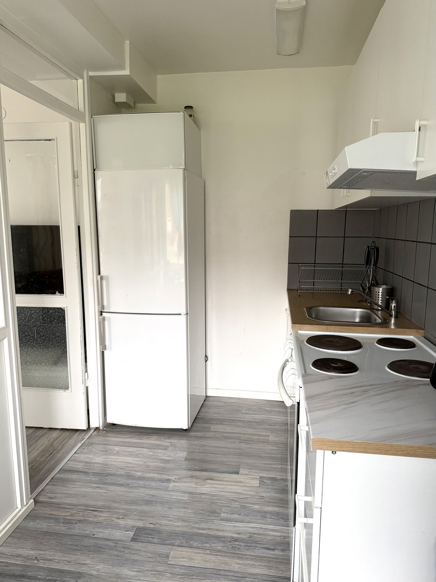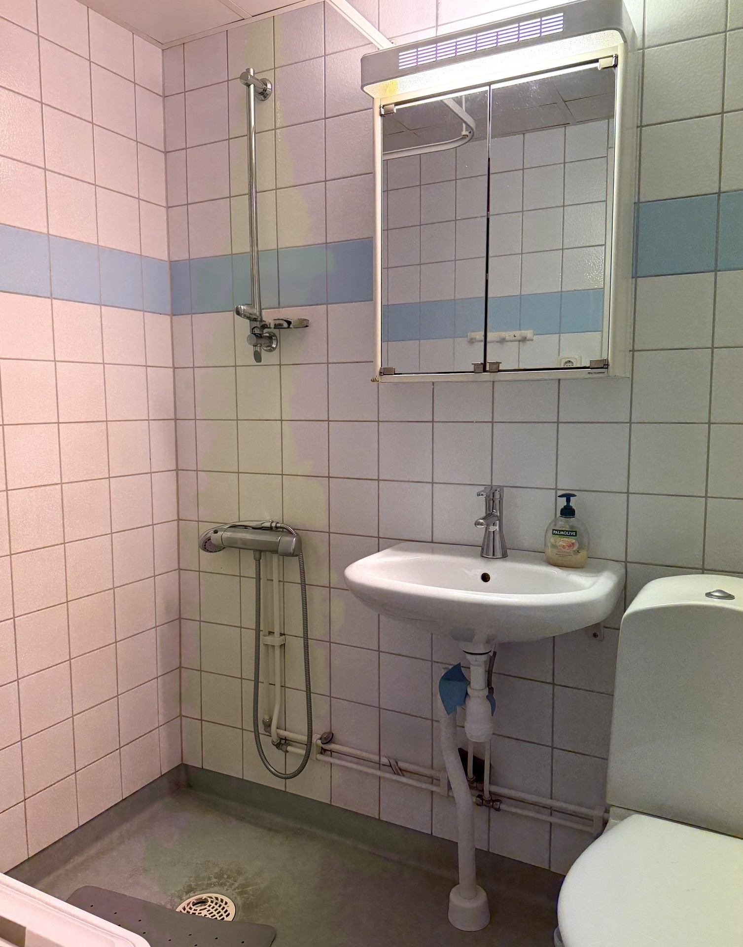 Hall med laminatgolv. Badrum med plastmatta på golv och kakel på vägg. Utrustat med toalett, tvättställ samt dusch. Rum med laminatgolv. Kök med laminatgolv och plats för mindre matbord. Köket är utrustat med kyl/frys, spis samt fläkt.