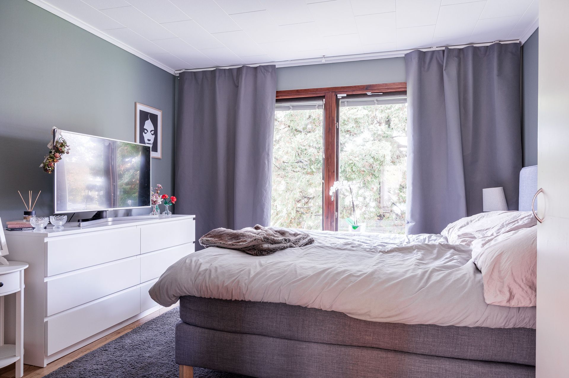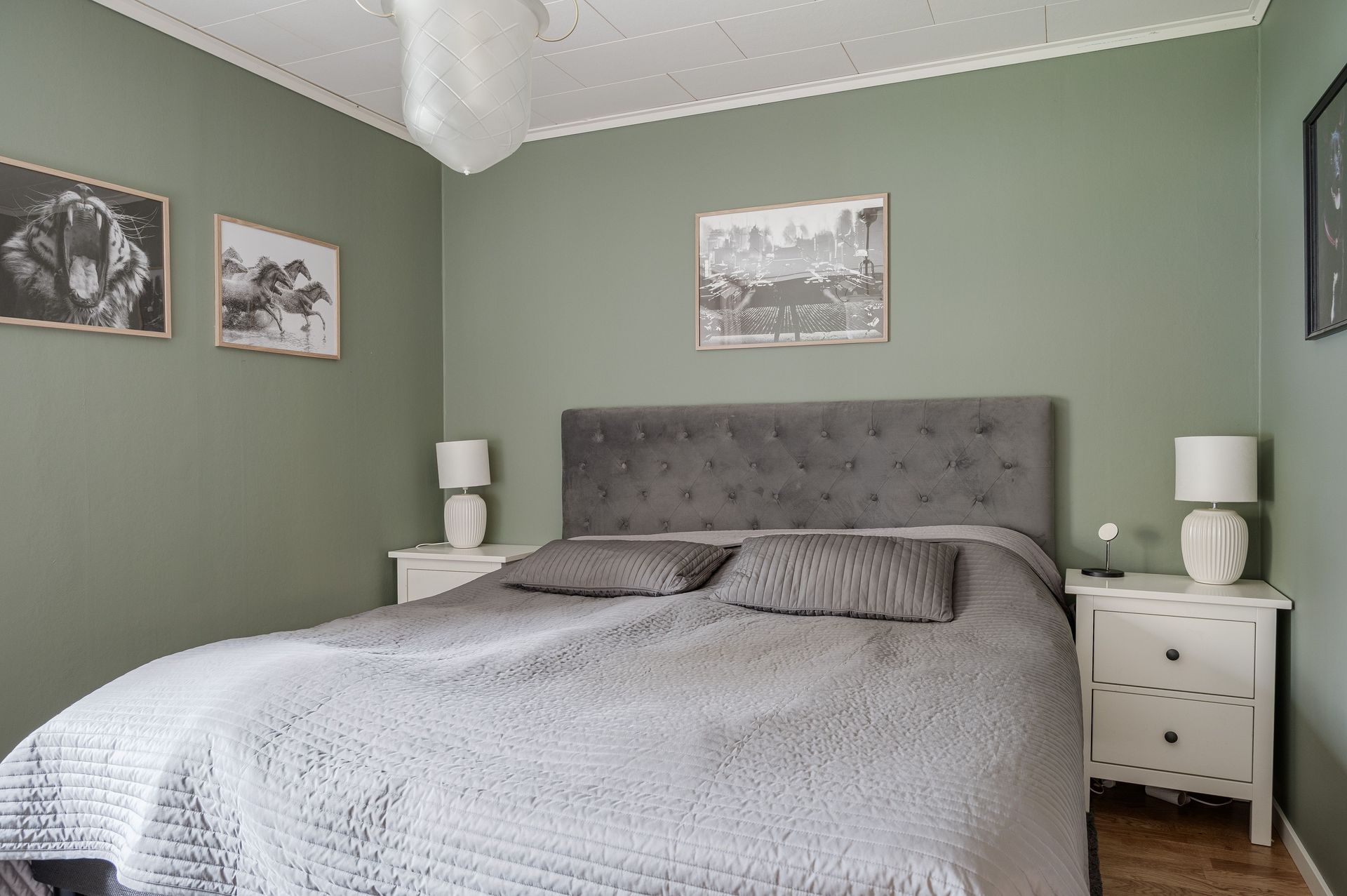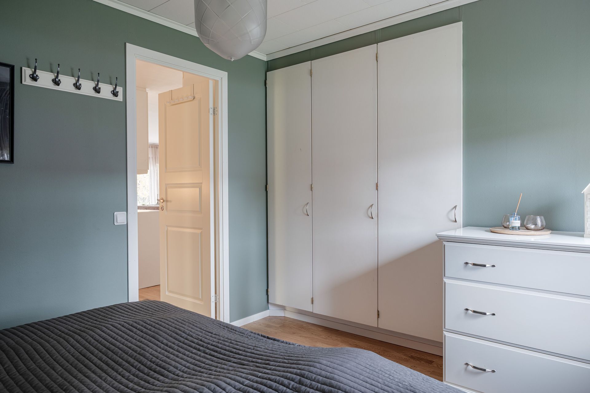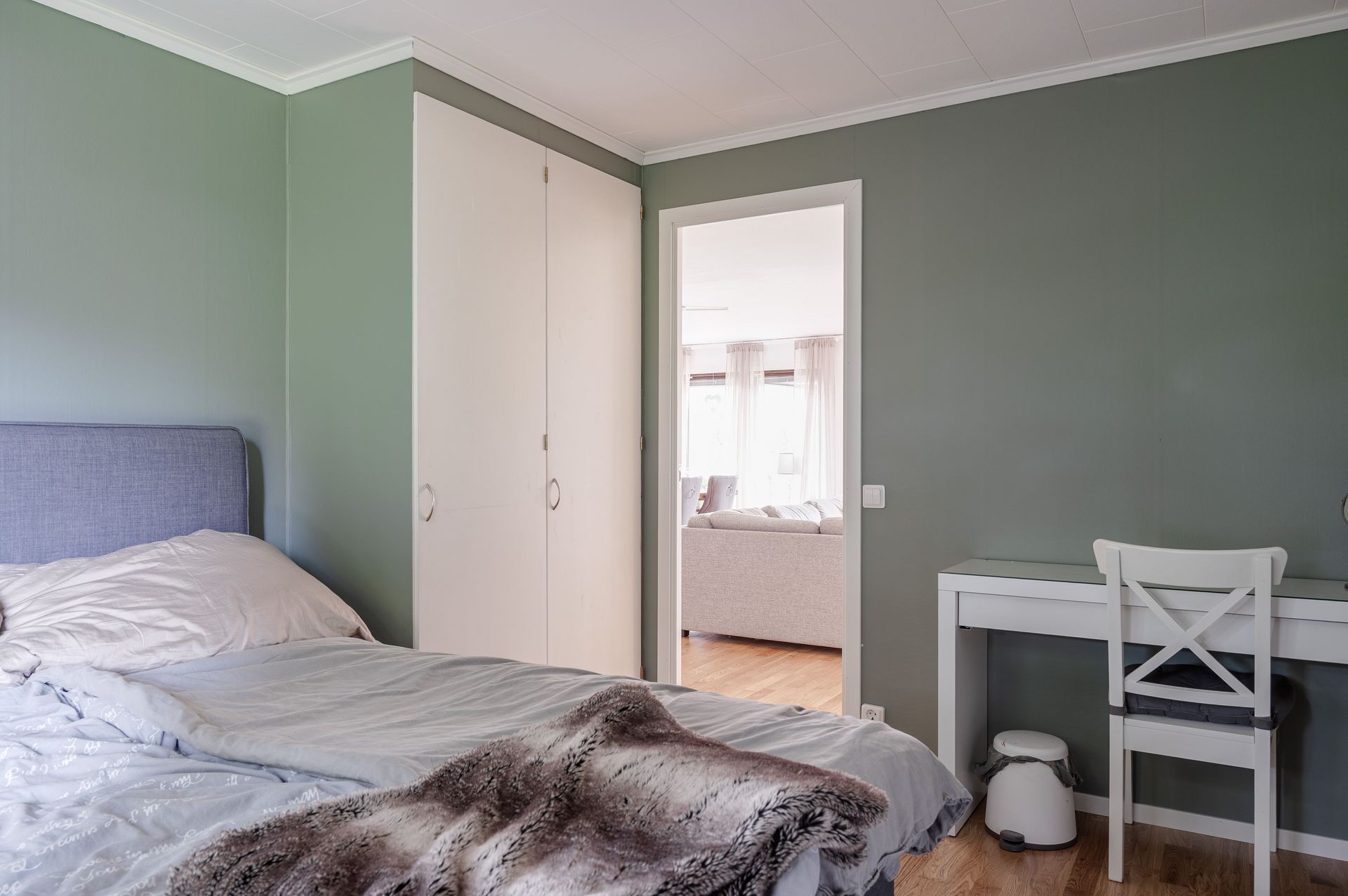 2024 - Renoverat sovrum med parkettgolv, målade väggar och innerdörrar.
