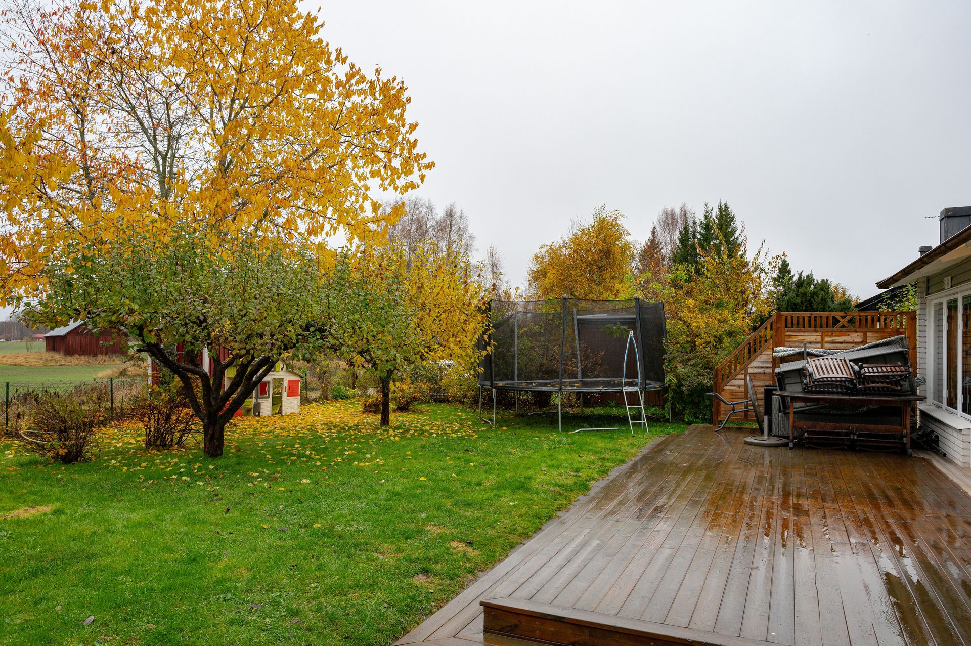 Altan i västerläge. Trädgård med gräsyta och plats för odling.