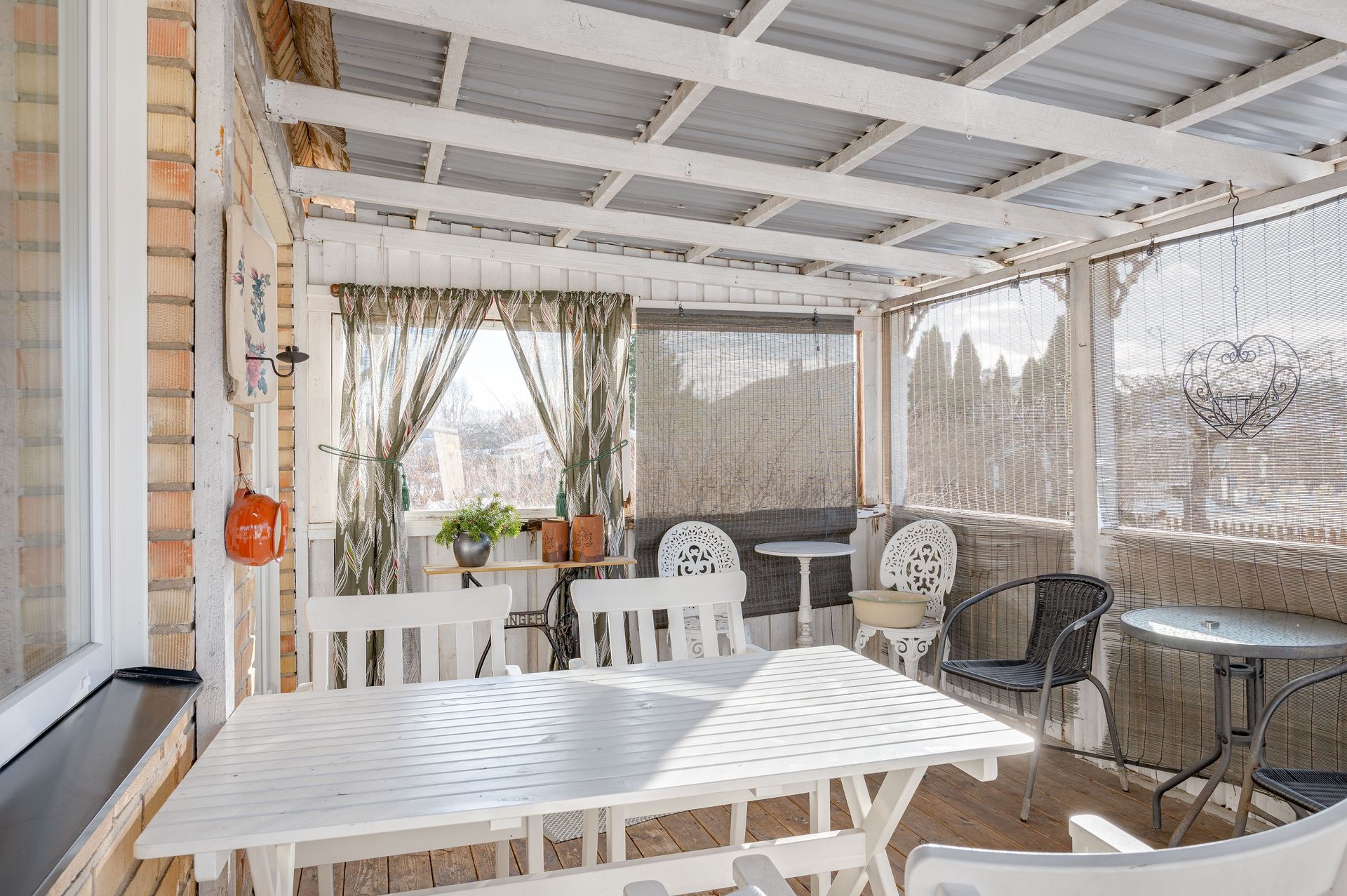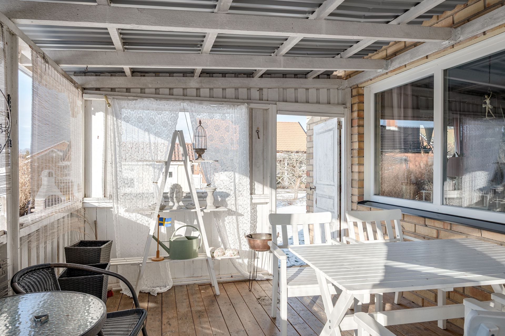Altan under tak, behov av renovering. Trädgård med gräsmatta och planteringar.
